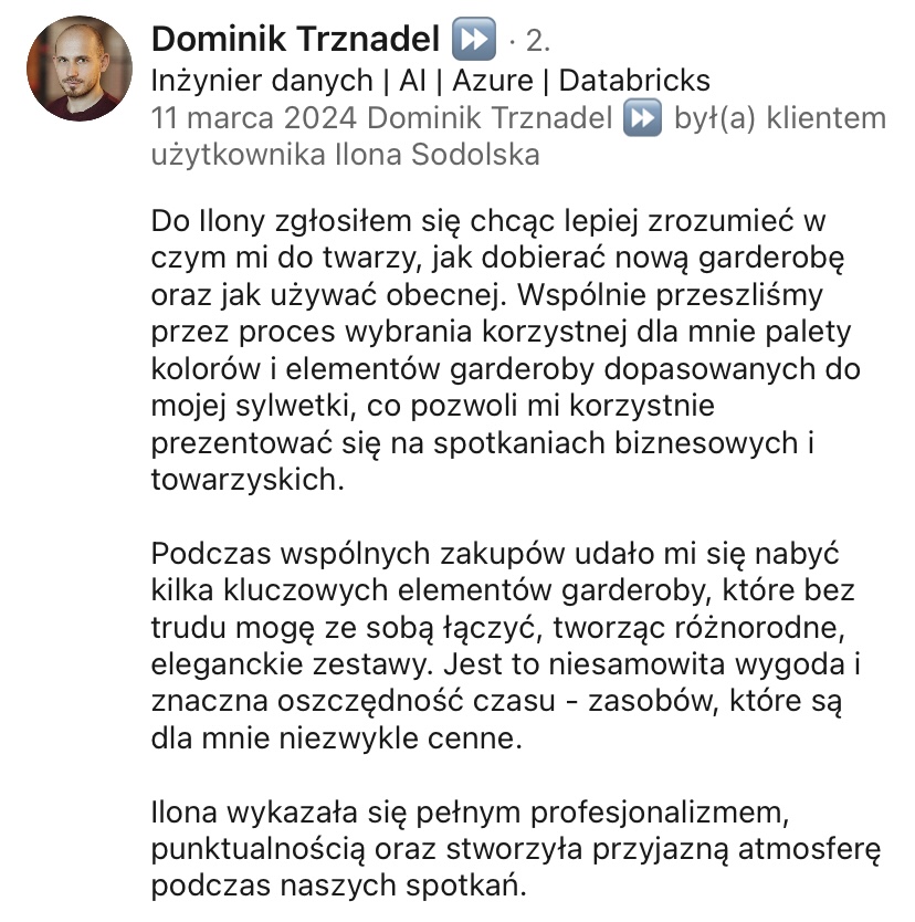 🕒 Czas trwania konsultacji to 4 godziny, które całkowicie odmienią Twój sposób patrzenia na kolory, fasony i komponowanie szafy!